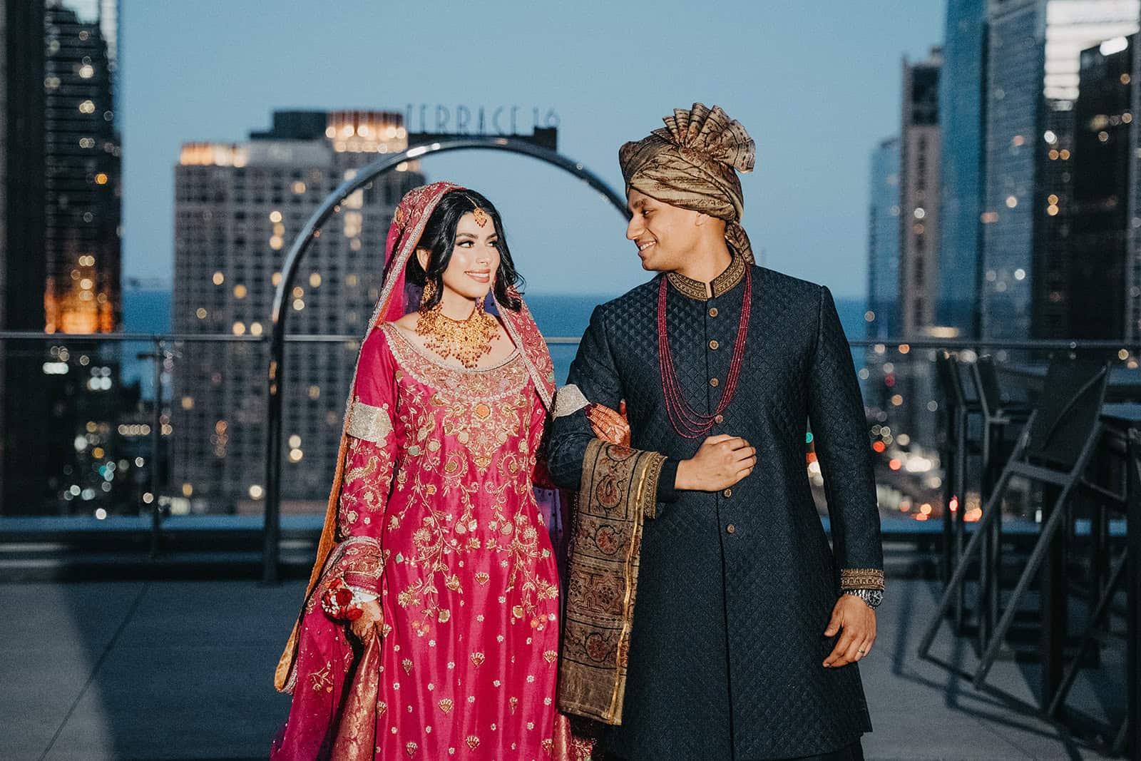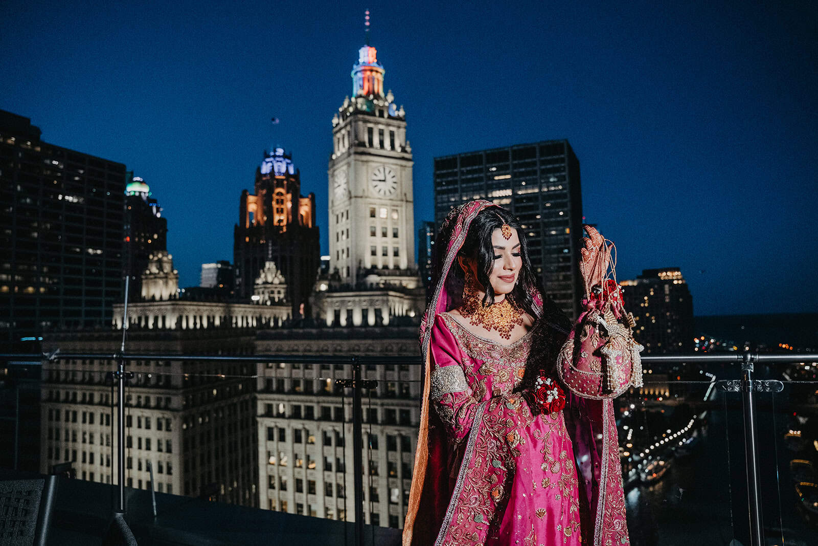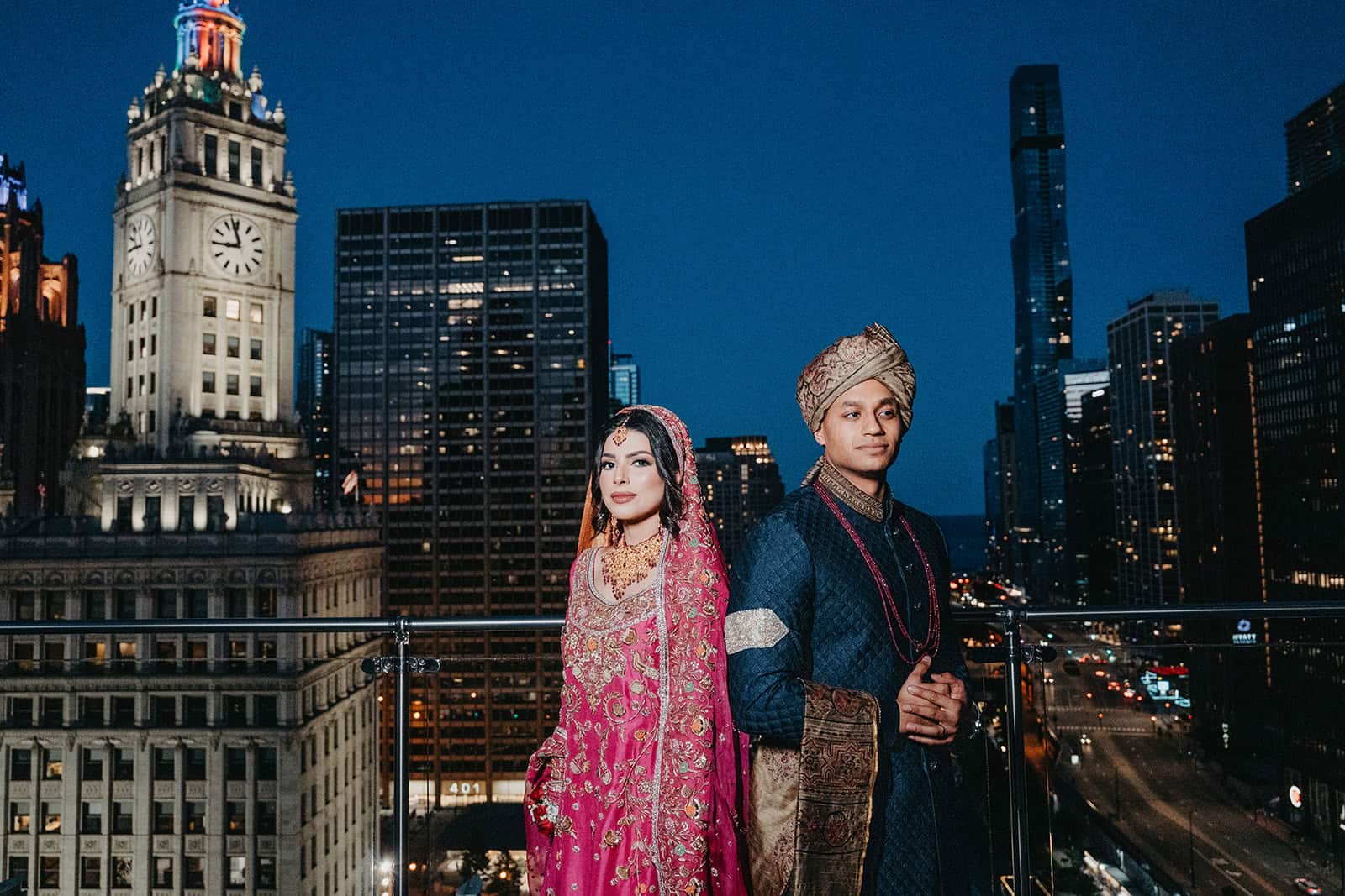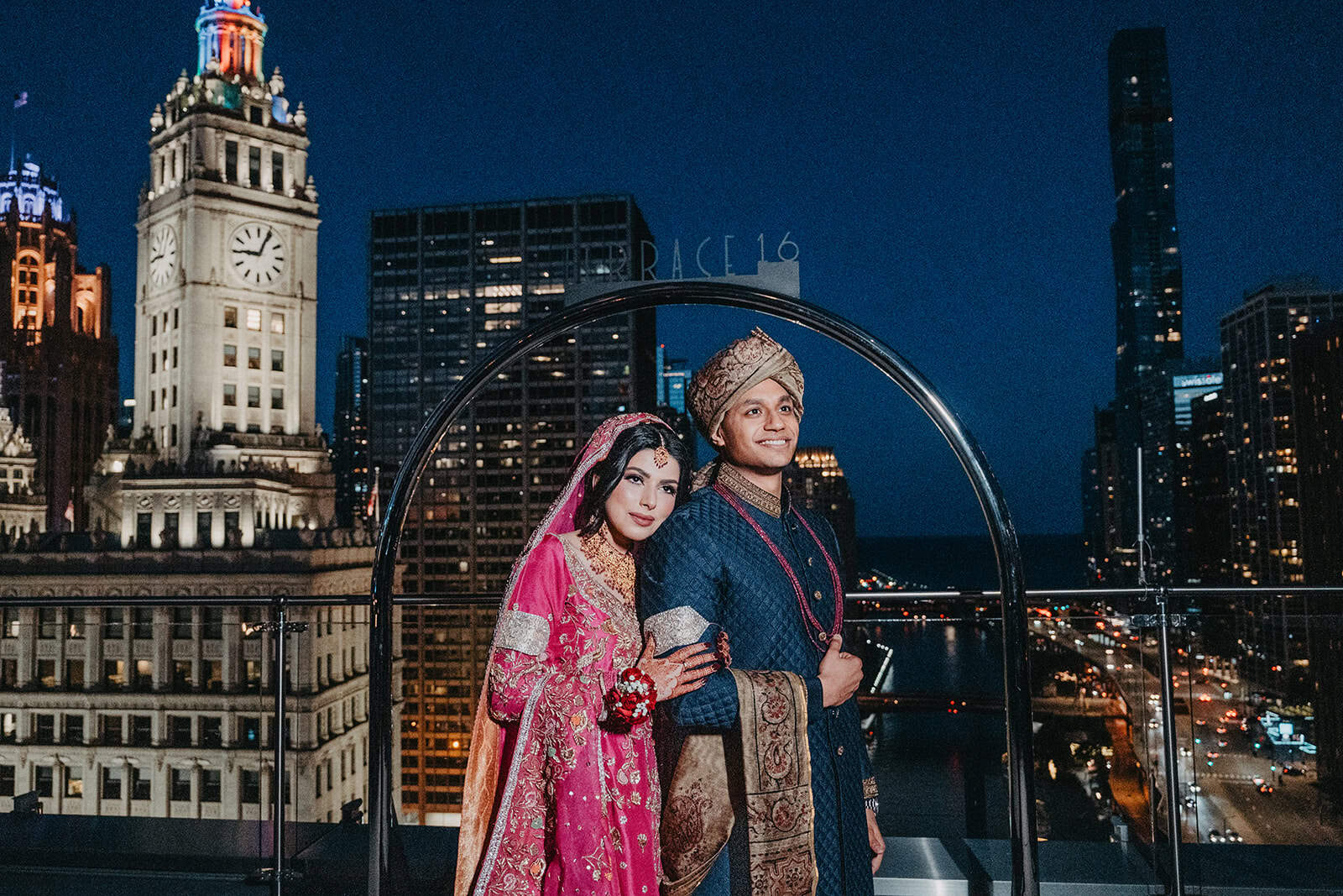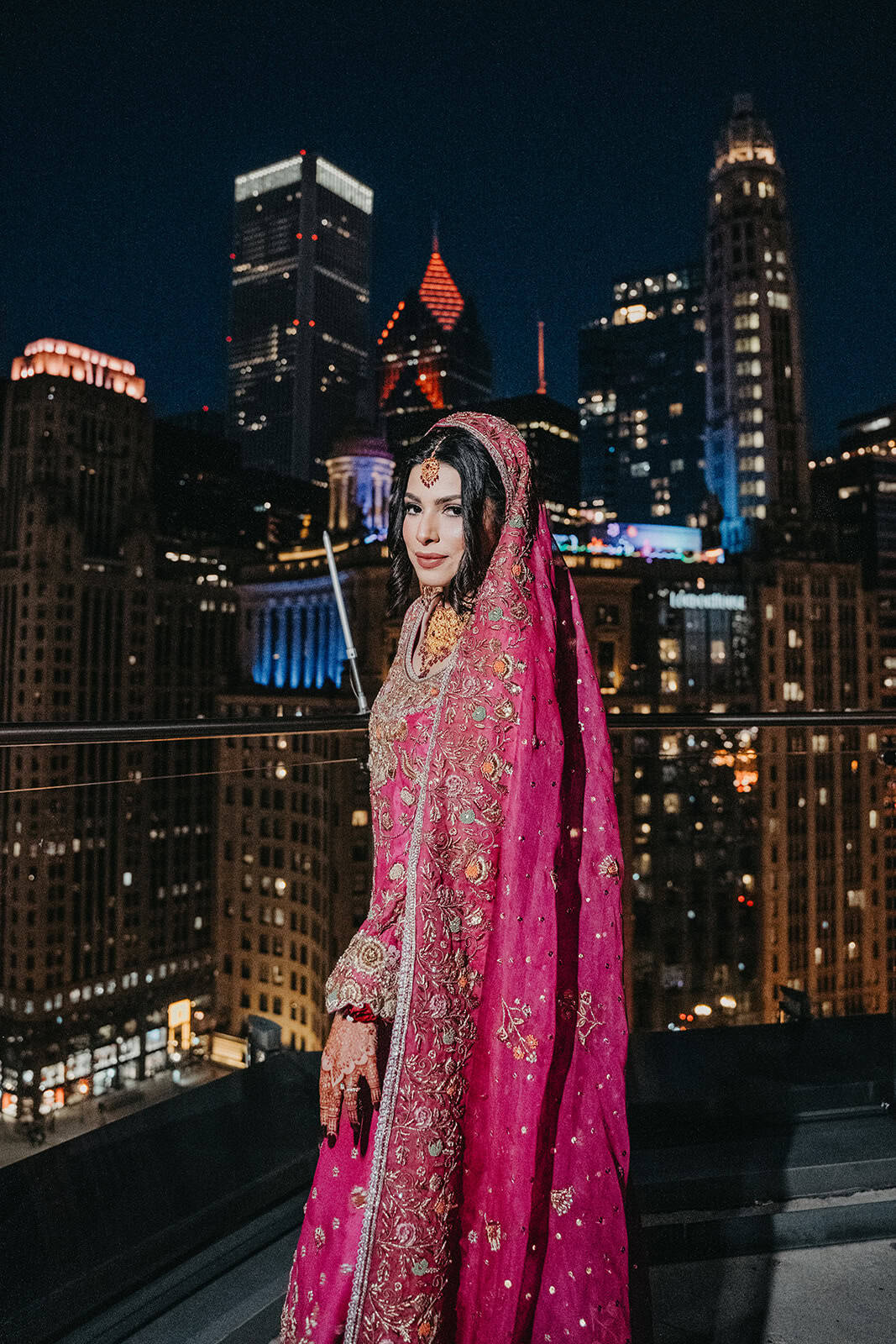 Trump International Hotel & Tower at 401 N Wabash Avenue is one of the most visually commanding wedding venues in the city. Rising above the Chicago River and the Magnificent Mile, the building is architecture as statement. For a Shaadi — the main wedding ceremony and reception — there is no backdrop in Chicago more cinematic. And for Hoor and Kumeil, it delivered something even most Trump Tower weddings don’t get: the rooftop.