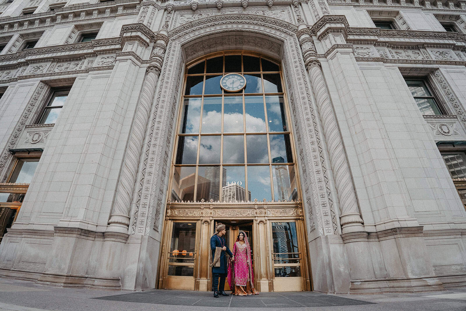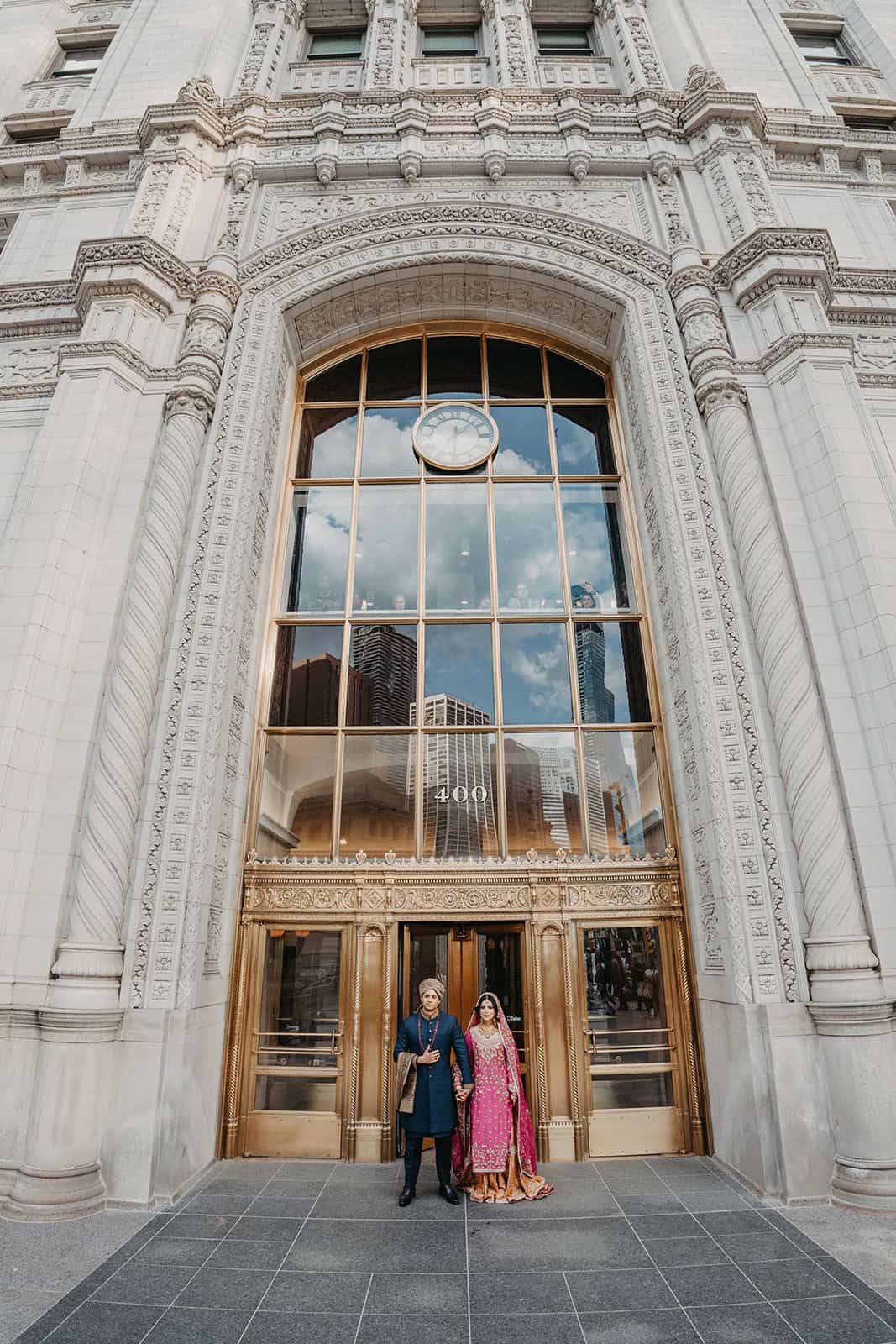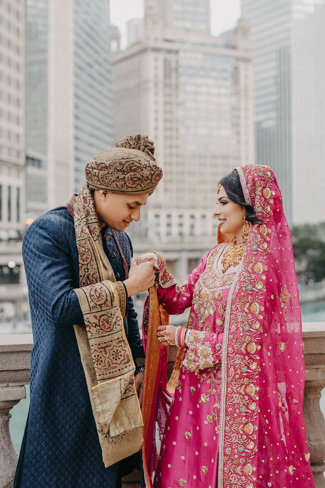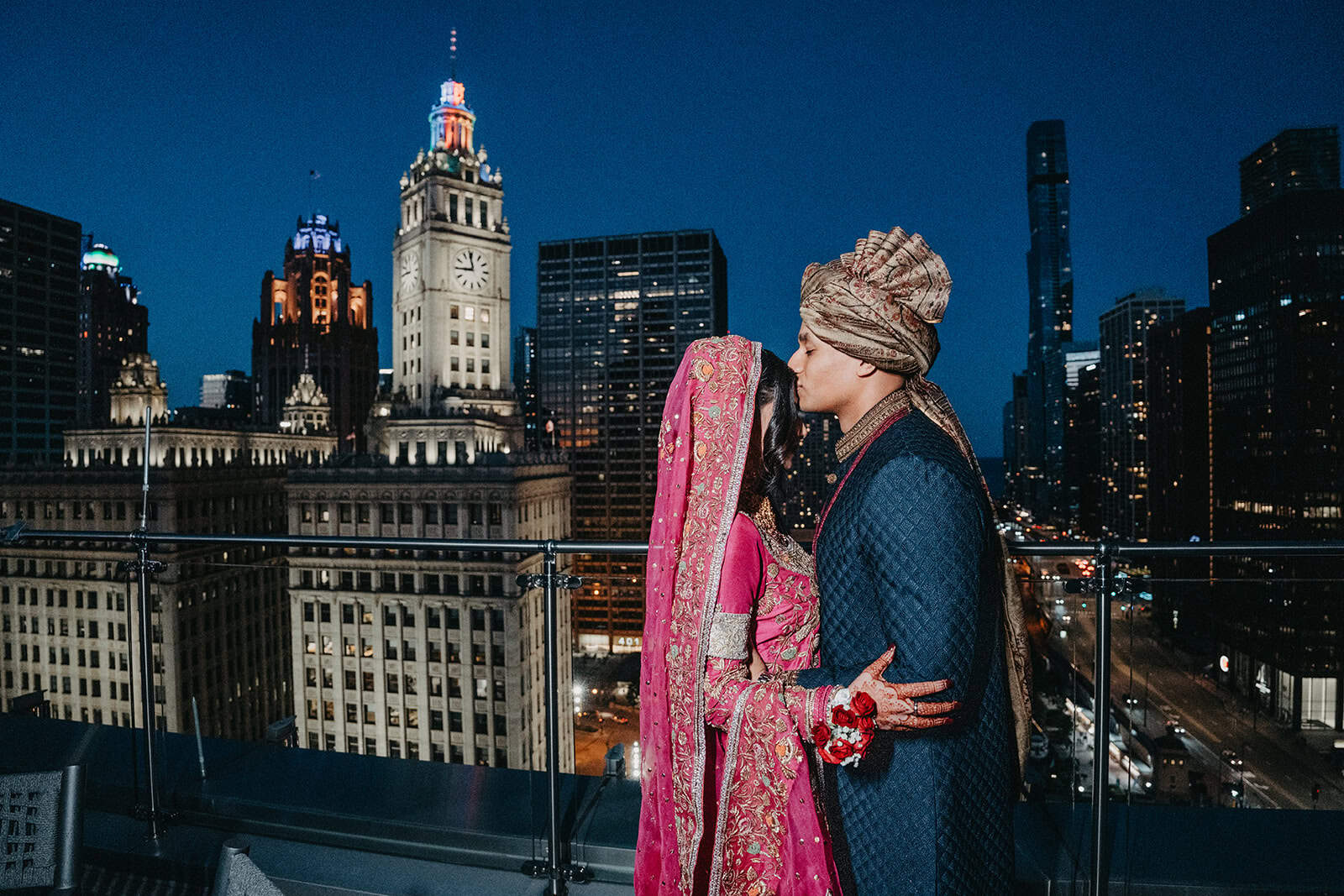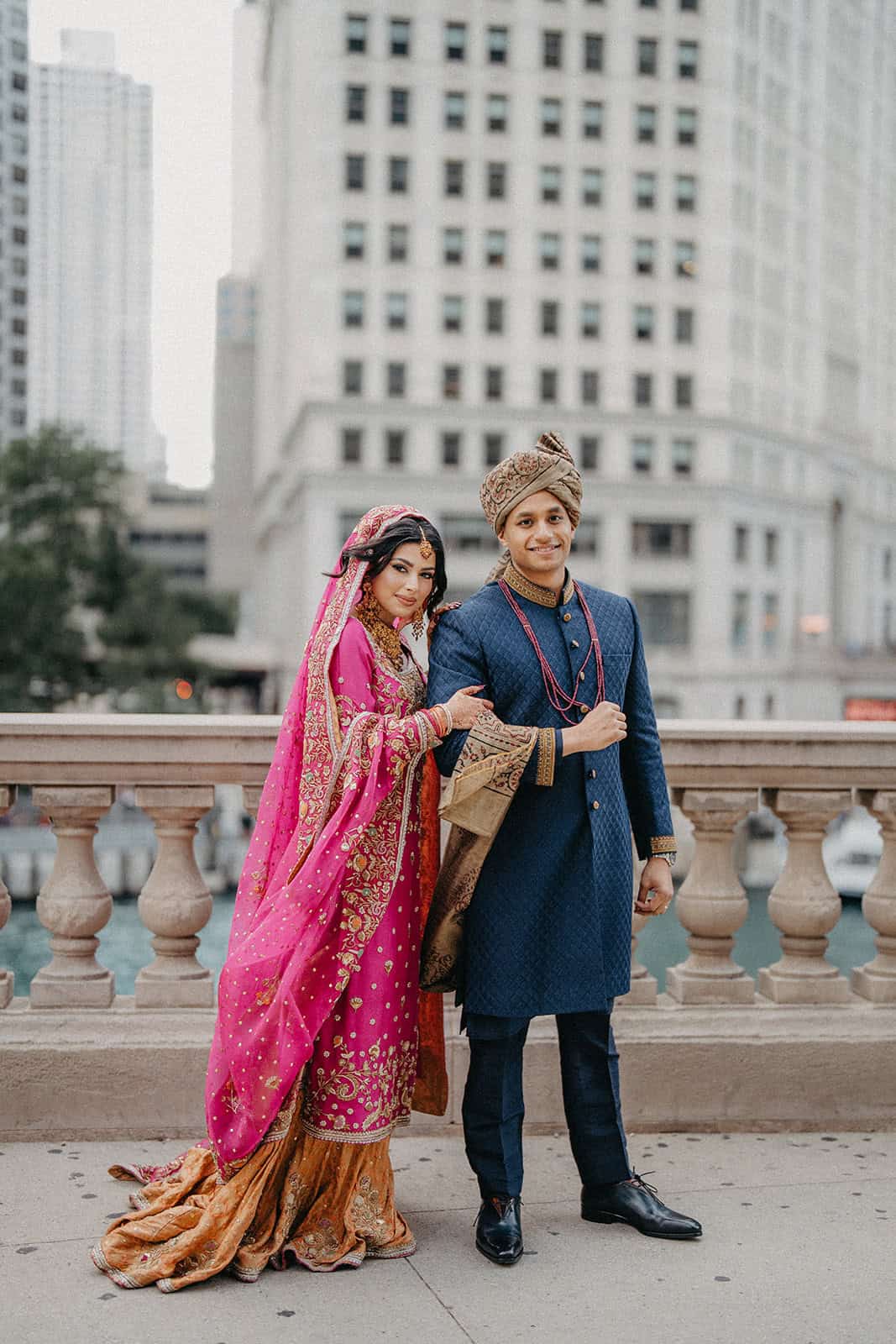Trump International Hotel & Tower at 401 N Wabash Avenue is one of the most visually commanding wedding venues in the city. Rising above the Chicago River and the Magnificent Mile, the building is architecture as statement. For a Shaadi — the main wedding ceremony and reception — there is no backdrop in Chicago more cinematic. And for Hoor and Kumeil, it delivered something even most Trump Tower weddings don’t get: the rooftop.