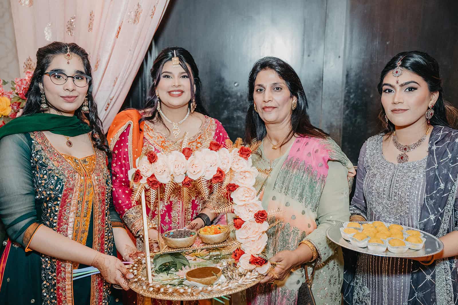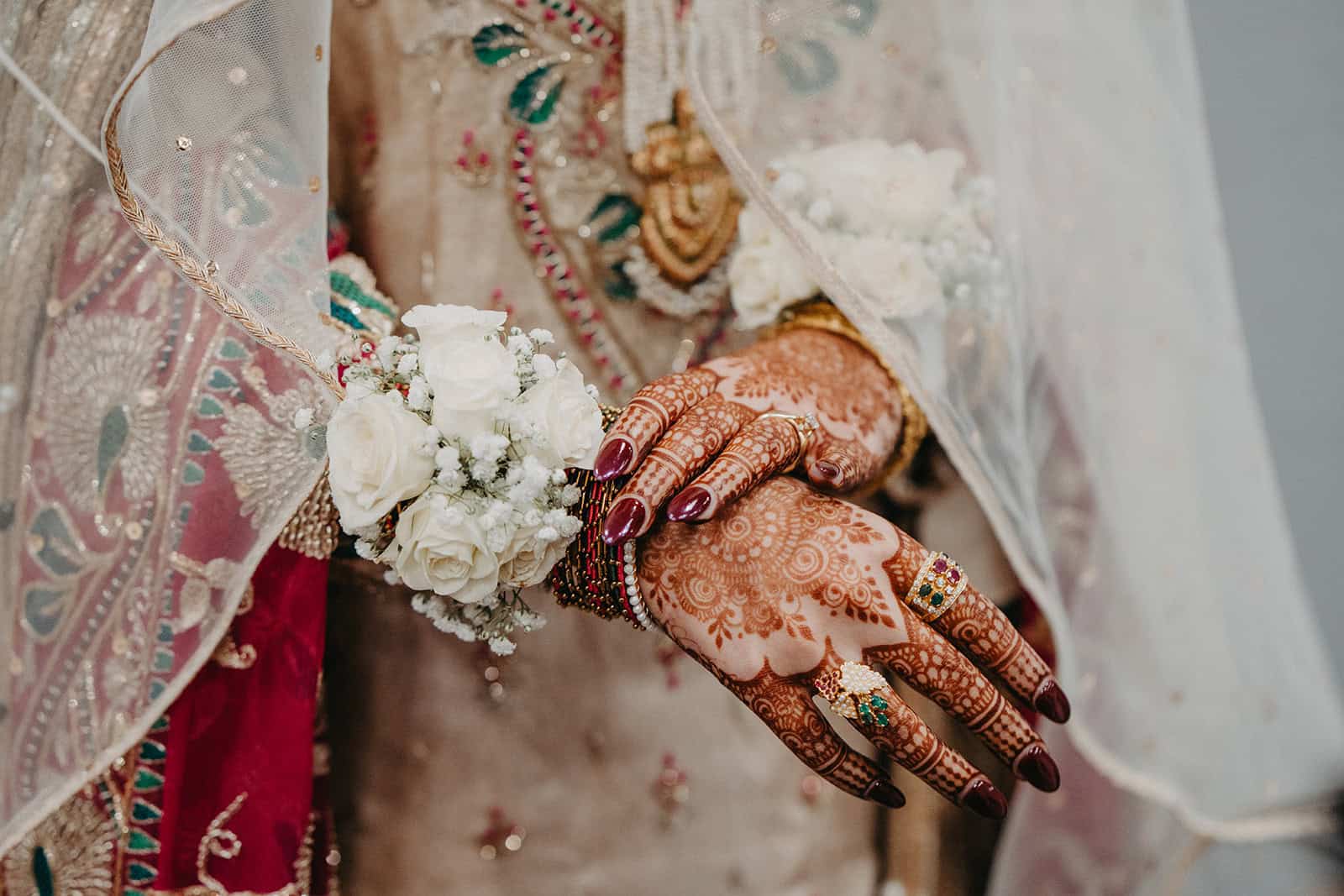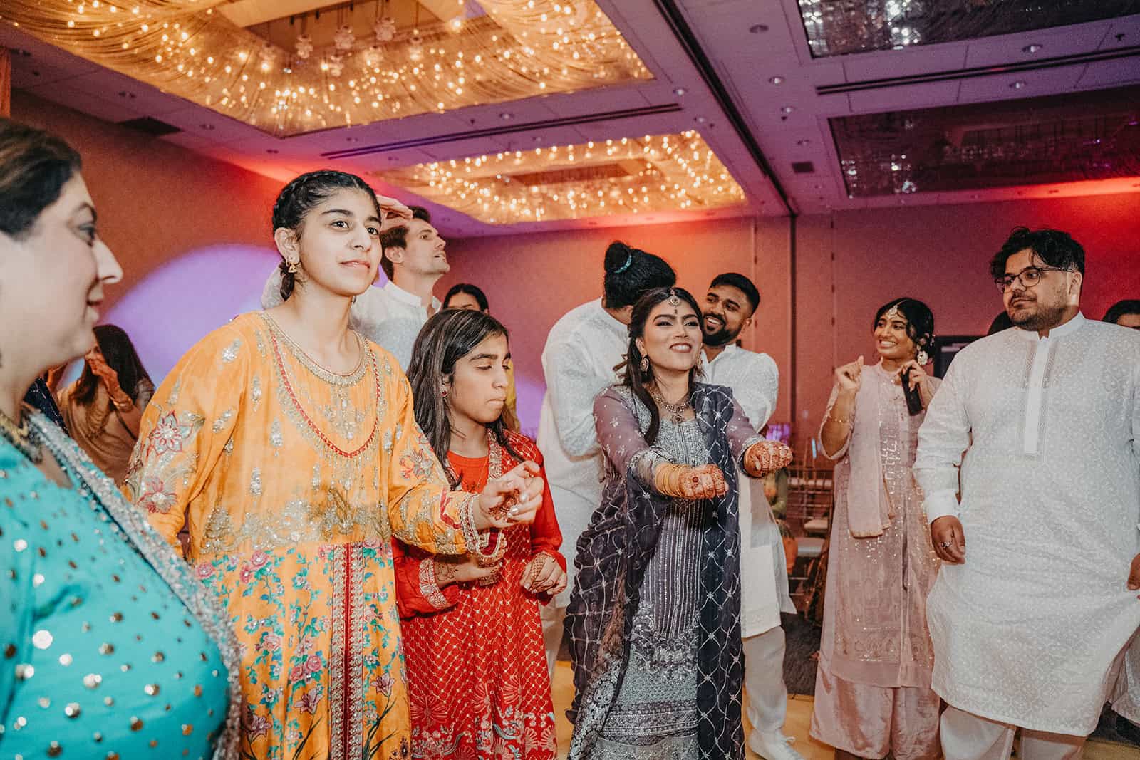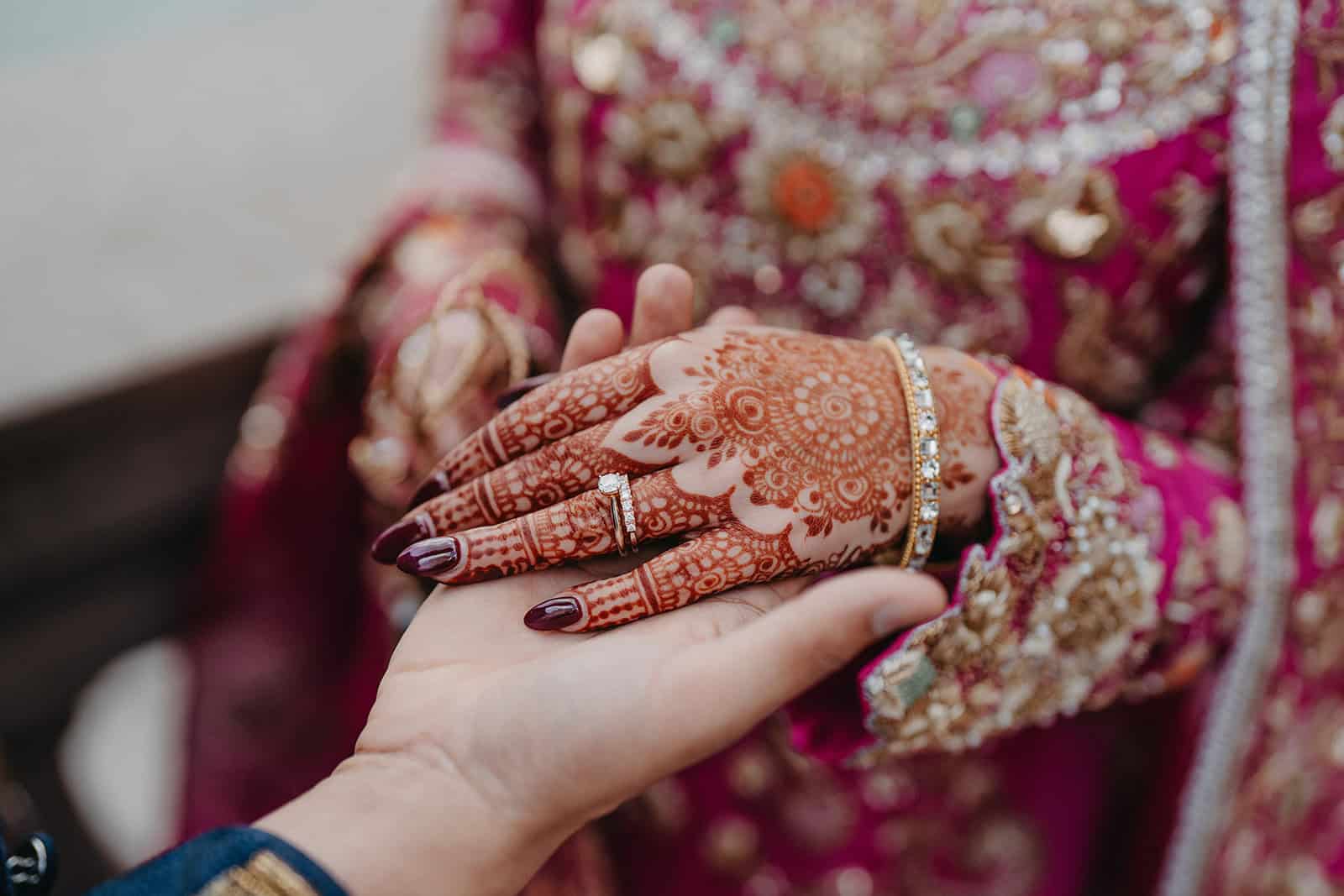 Mehndi night is one of the most photographically rich events in any Muslim wedding. The intricate henna patterns applied to Hoor’s hands and arms, the women gathered close in conversation and laughter, the vibrant fabric and florals, the music building in the background — it is an evening that rewards a photographer who slows down and watches. We’ve learned over 20 years of documenting South Asian and Muslim celebrations that the best images from Mehndi night are never staged. They come from a grandmother leaning in to inspect the henna. A cousin caught mid-laugh. The bride’s eyes in a quiet moment when the room falls still around her.
