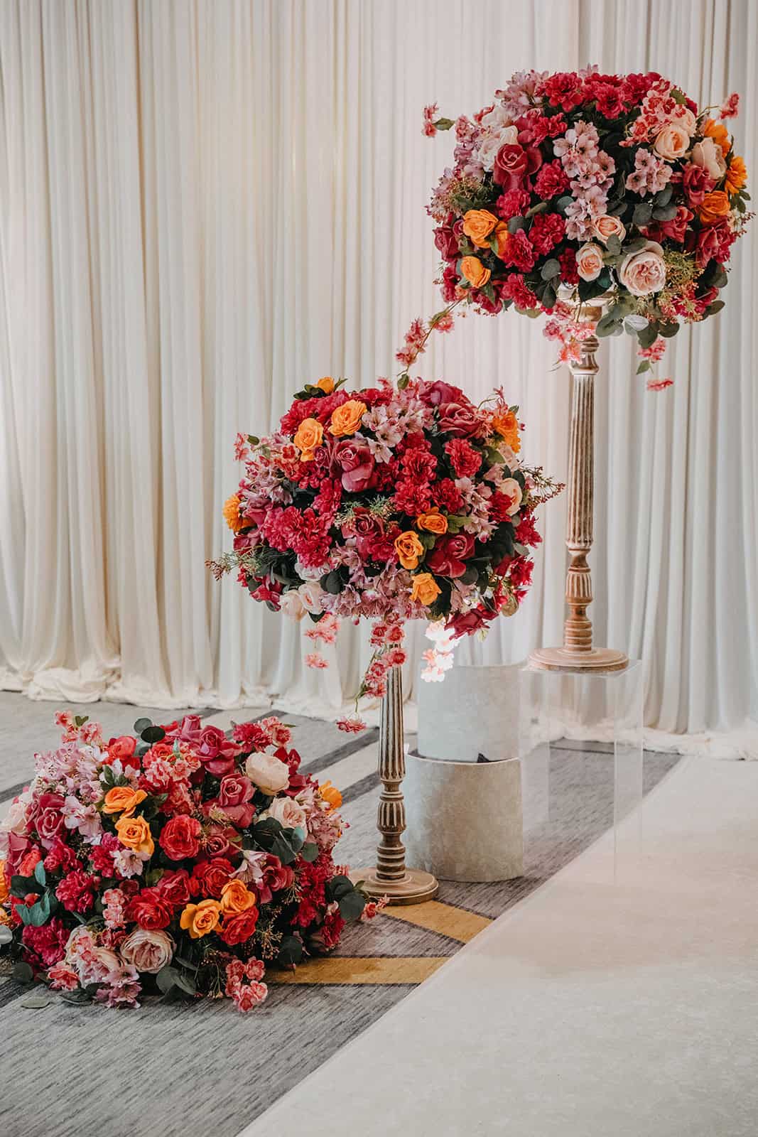 From the rooftop, the celebration moved directly into the reception venue — on the same level, giving the evening a seamless flow that guests felt immediately. One moment you are outside with the city spread around you, the next you are inside a grand reception space with the same skyline framed through floor-to-ceiling glass.