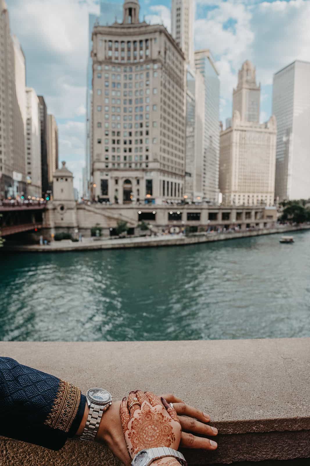Open air, high above the city, with the Chicago River threading below and the skyline in every direction — it is one of the most dramatic portrait locations we have ever worked in. The combination of the late afternoon sun, the architectural geometry of the tower, and two people completely present with each other produced images that belong on a wall, not just a screen.