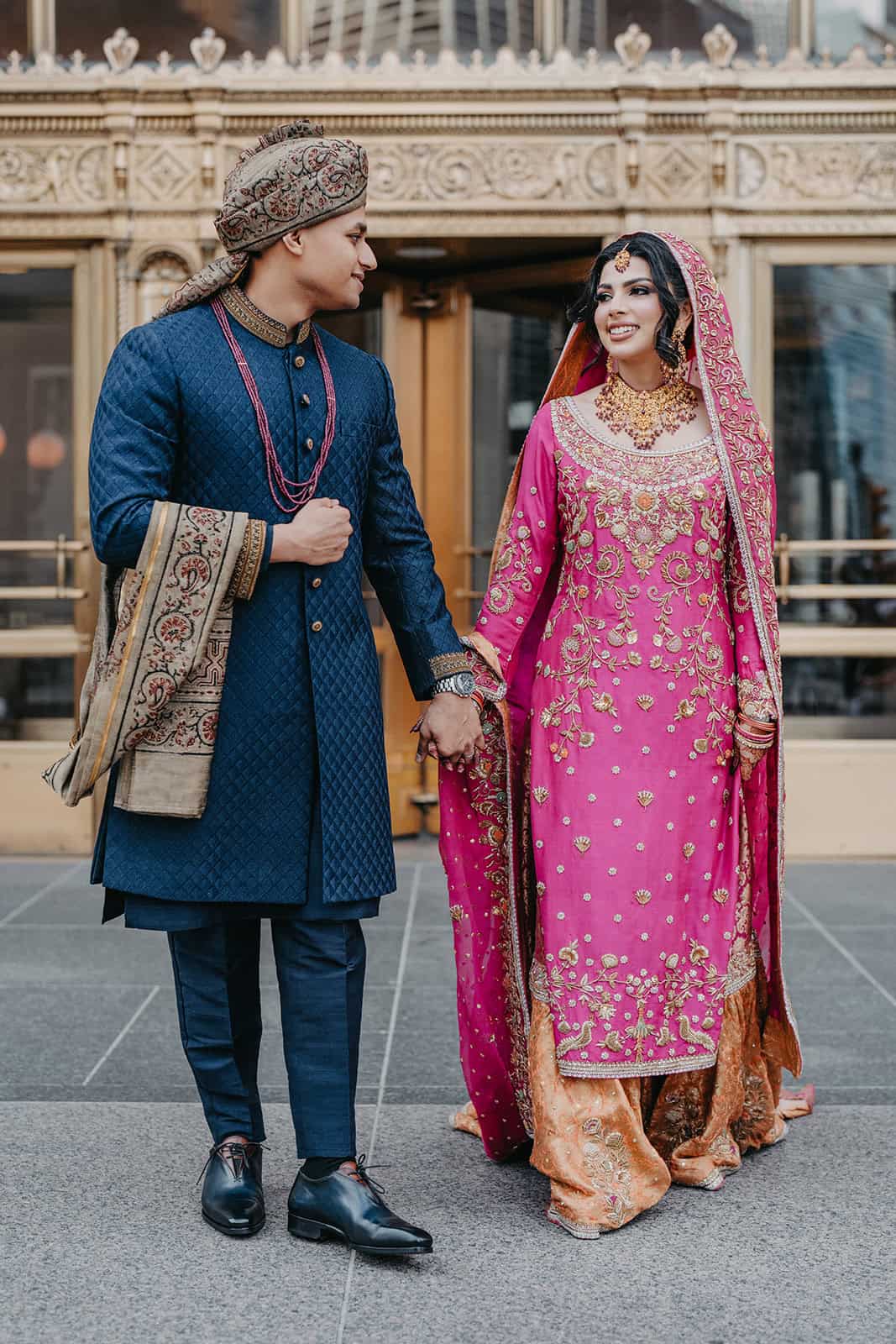 After bridal prep and the Baraat arrival, we took Hoor and Kumeil up to the Trump Tower rooftop terrace for their couple portraits during cocktail hour — and it is difficult to overstate how extraordinary that light was.
