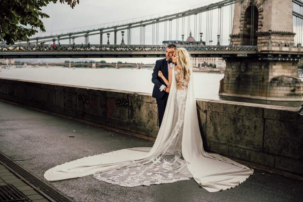 Elegant bride and groom sharing a moment with a scenic city view of Budapest and the Danube River in the background during a luxurious wedding photoshoot.