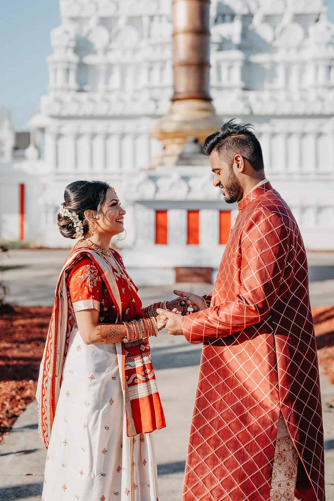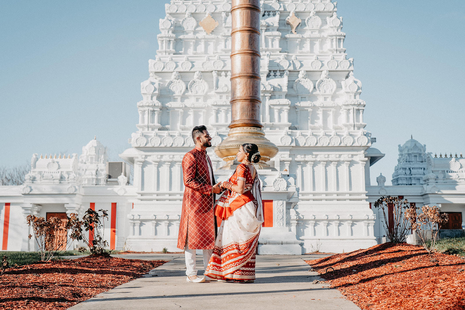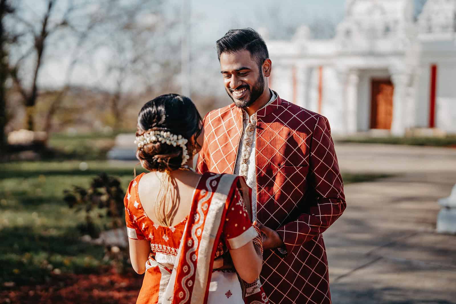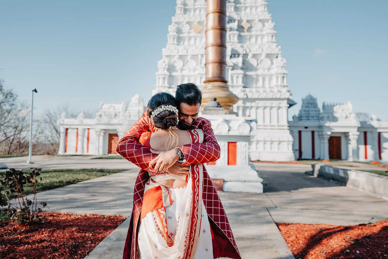 Located in Lemont, Illinois, the Hindu Temple of Greater Chicago offers a serene yet majestic setting for Hindu weddings. The temple grounds provided an elegant backdrop for the couple’s first look, family portraits, and ceremonial moments.