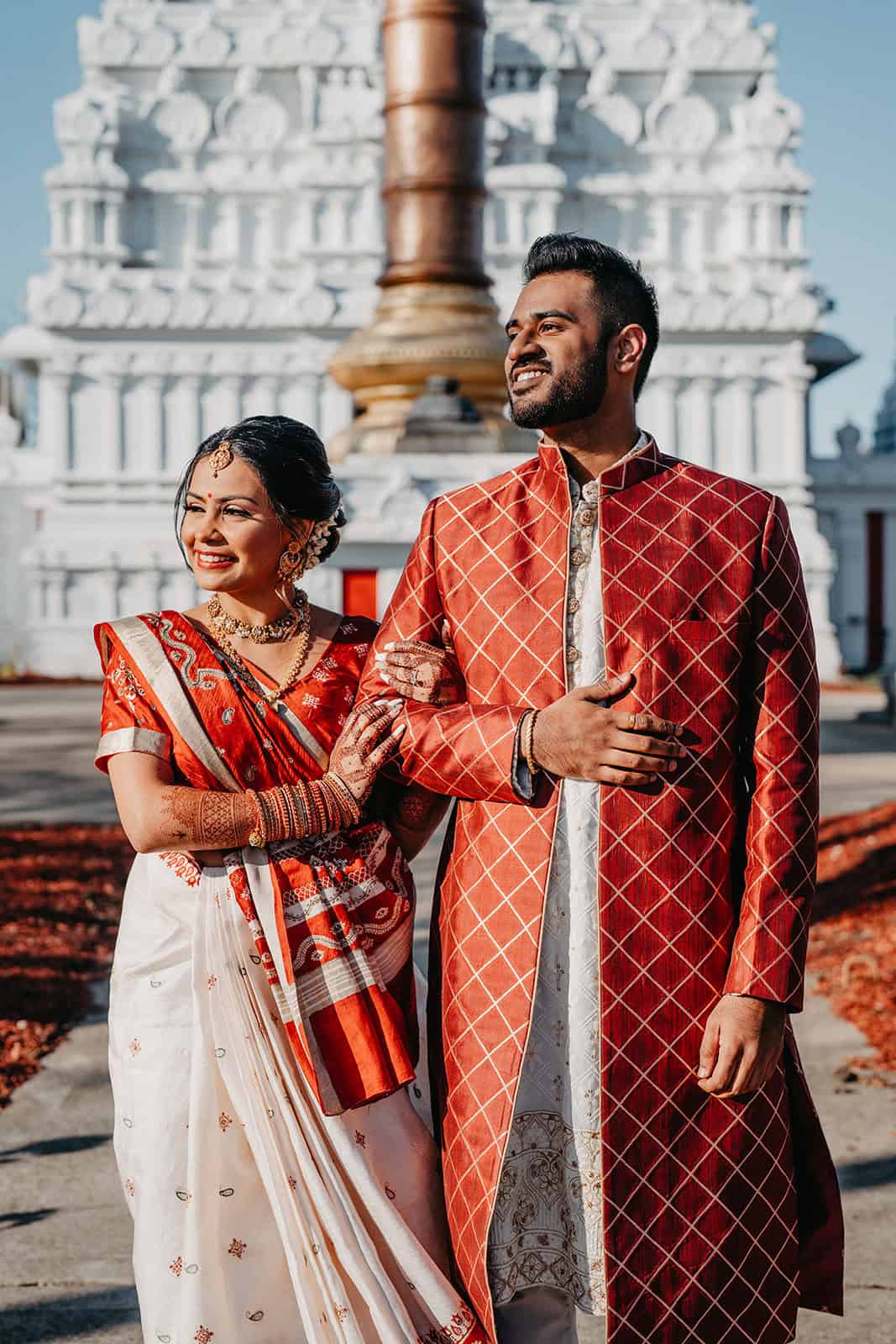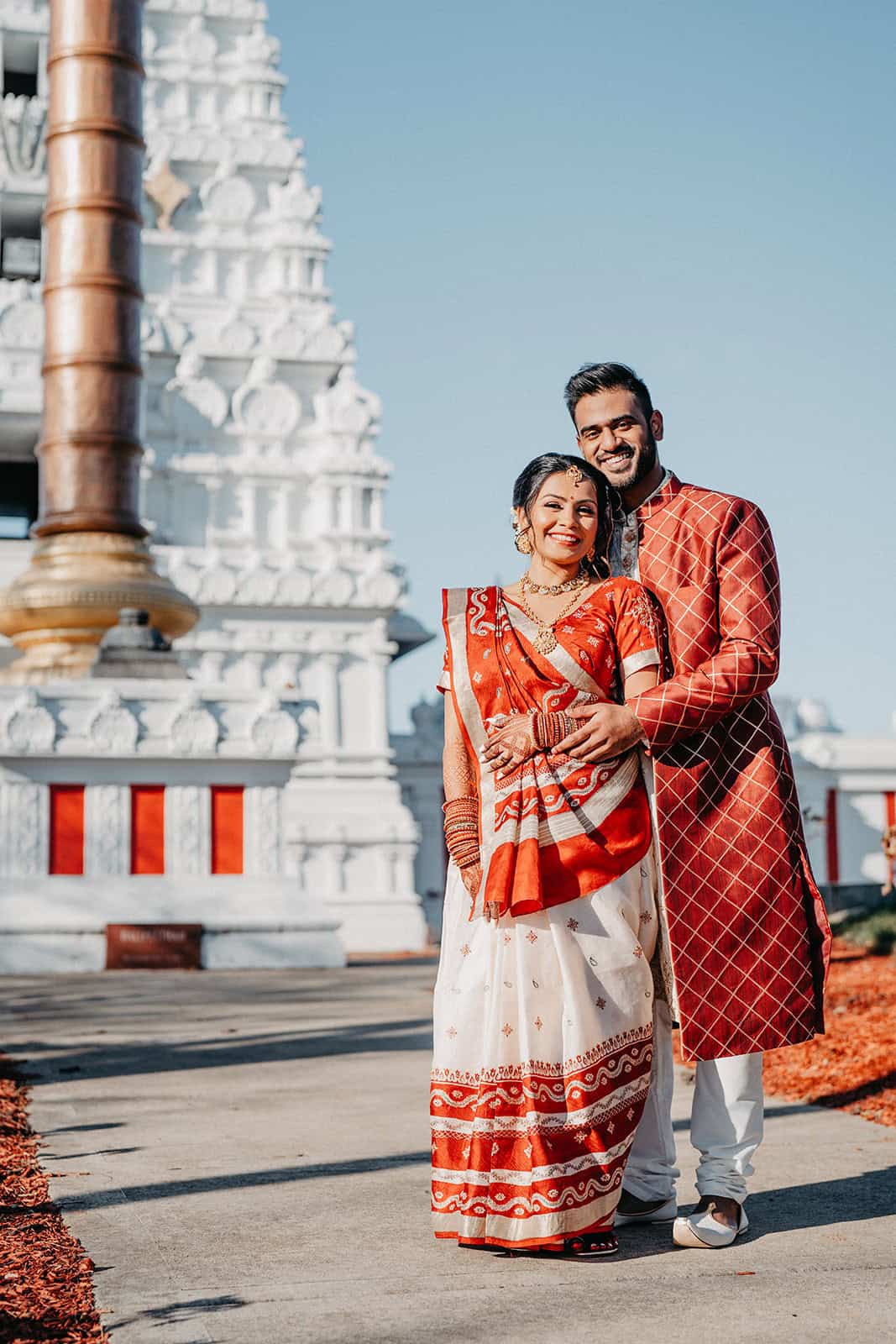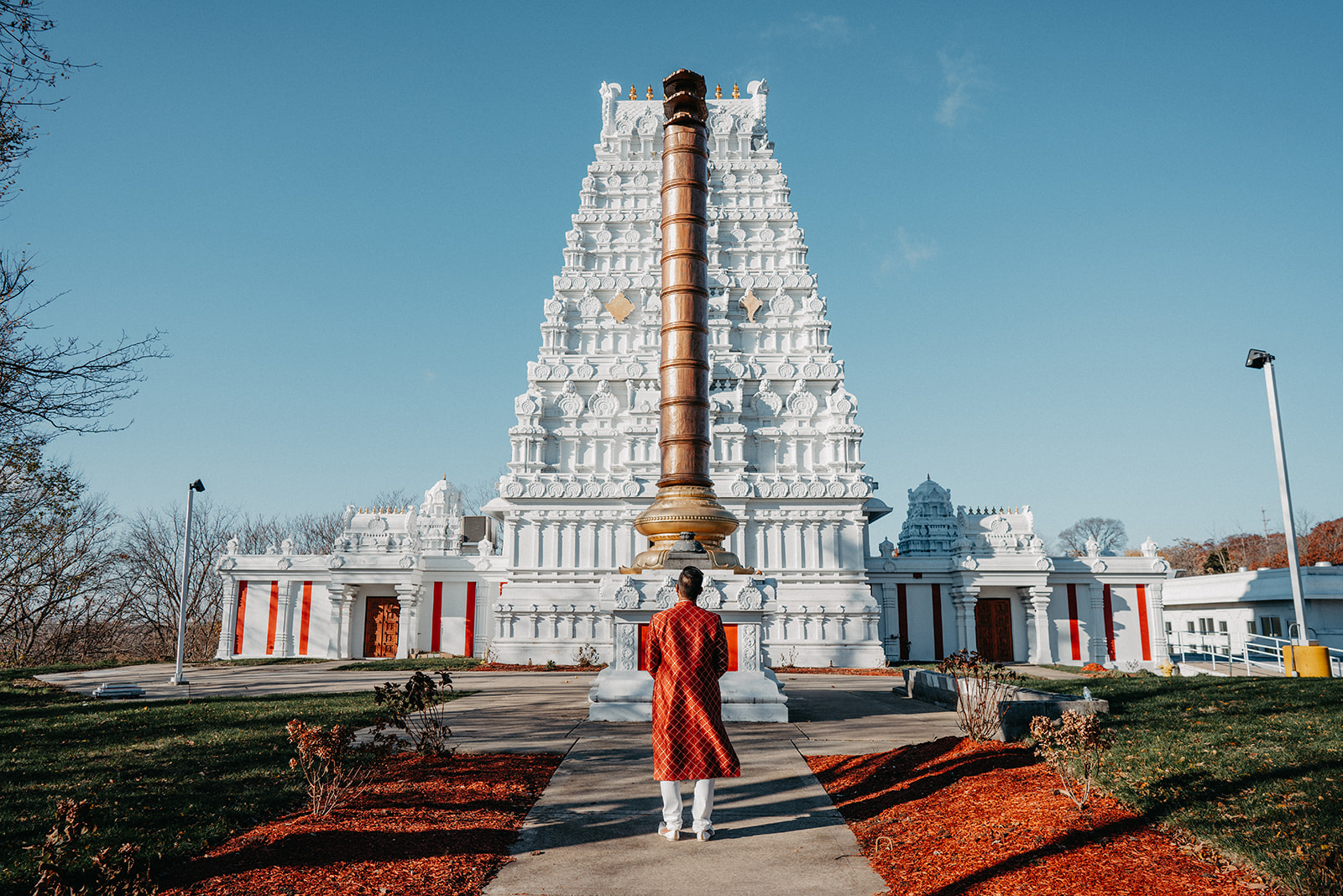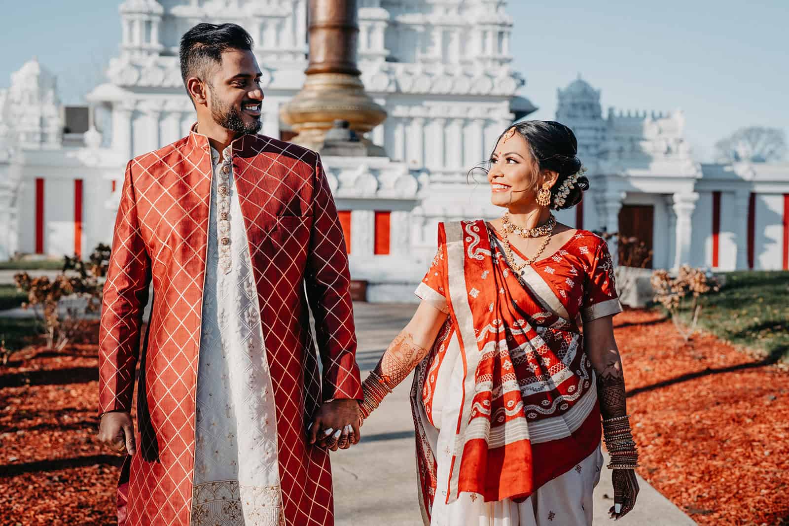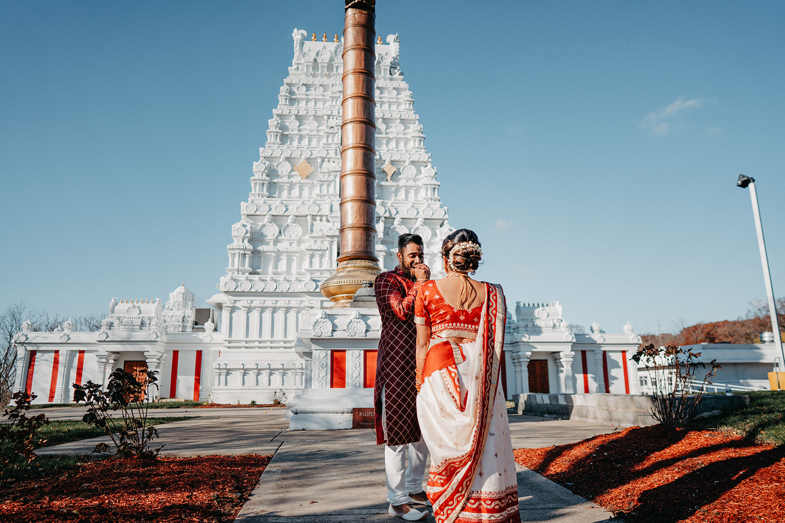Located in Lemont, Illinois, the Hindu Temple of Greater Chicago offers a serene yet majestic setting for Hindu weddings. The temple grounds provided an elegant backdrop for the couple’s first look, family portraits, and ceremonial moments.