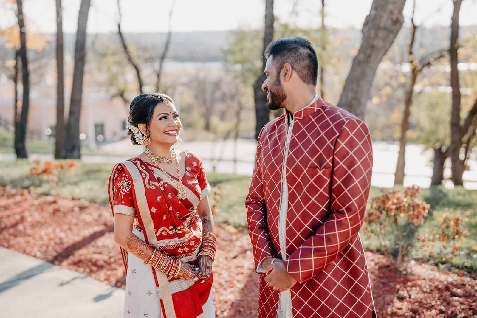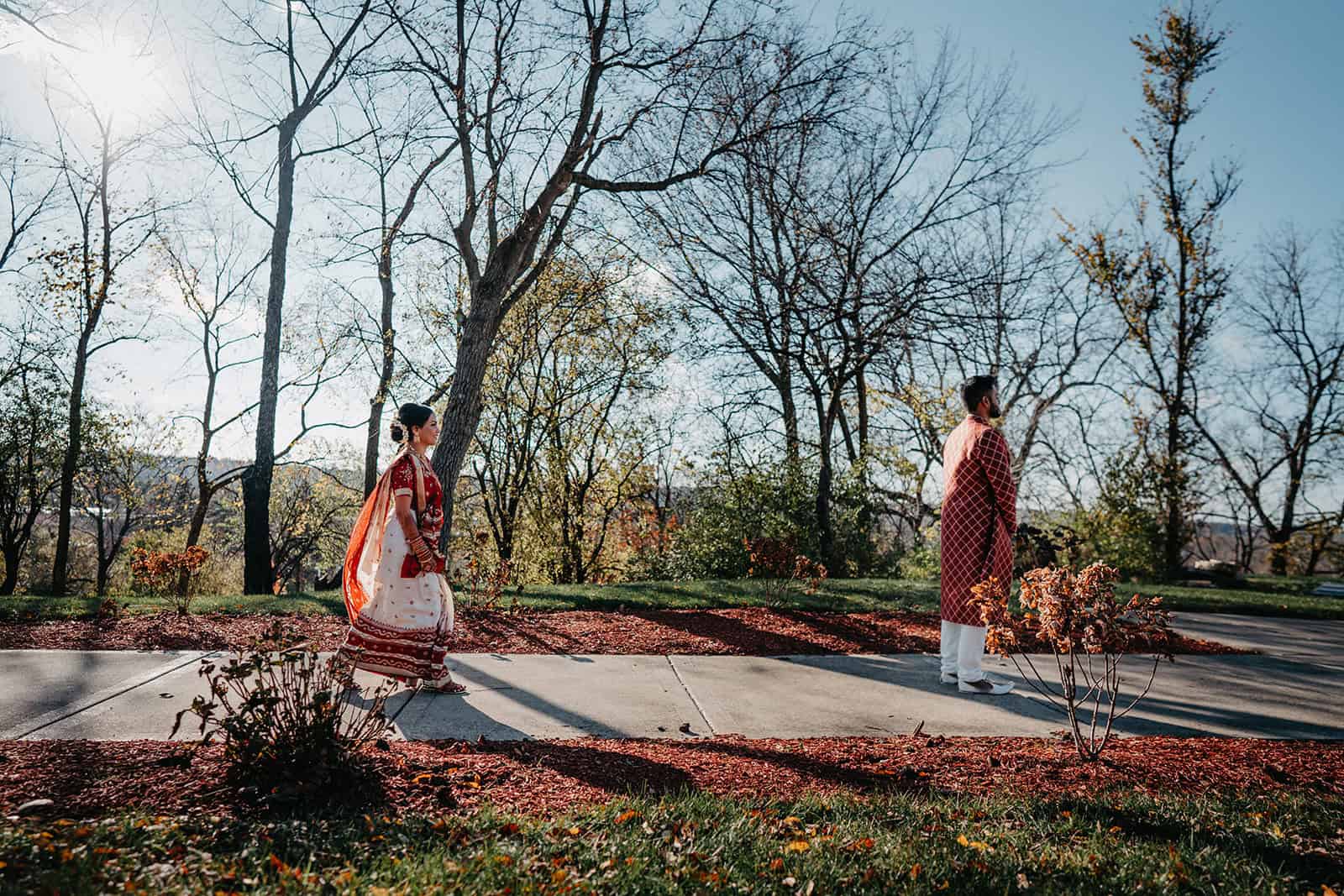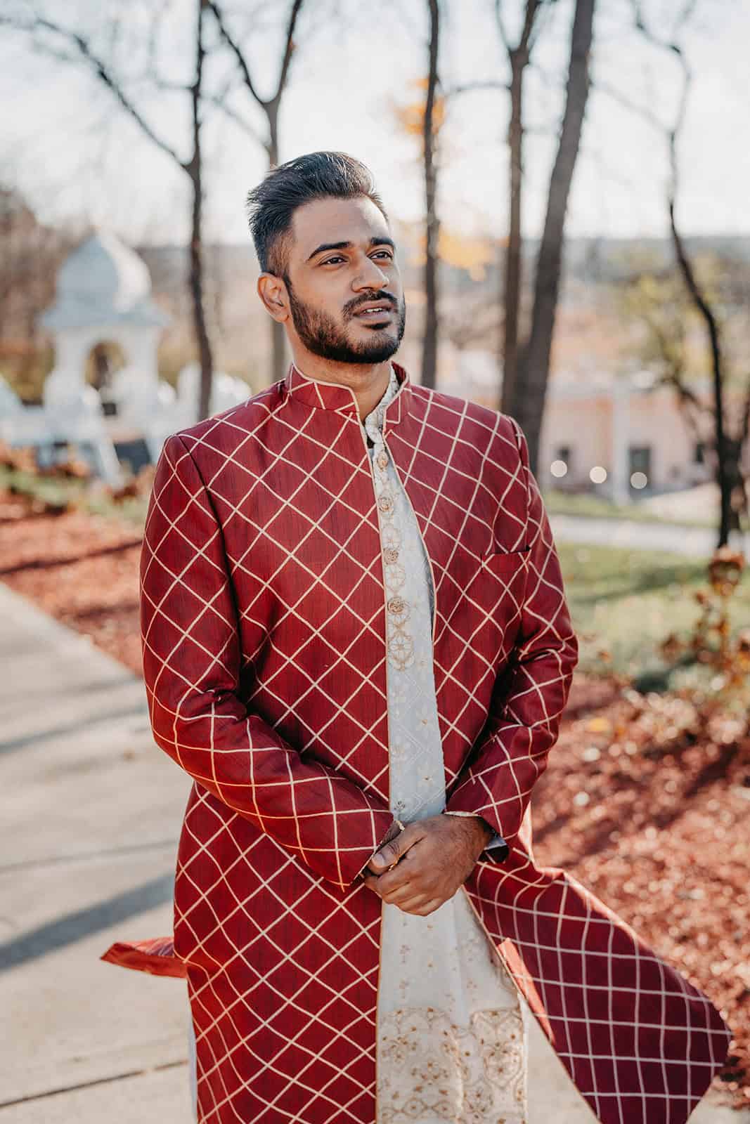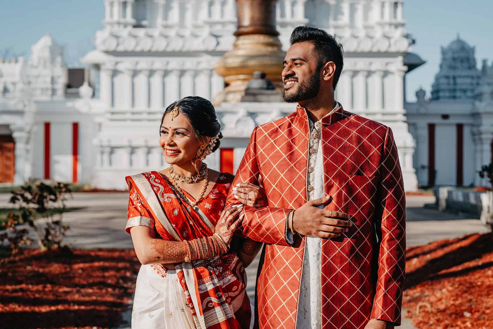 Located in Lemont, Illinois, the Hindu Temple of Greater Chicago offers a serene yet majestic setting for Hindu weddings. The temple grounds provided an elegant backdrop for the couple’s first look, family portraits, and ceremonial moments.